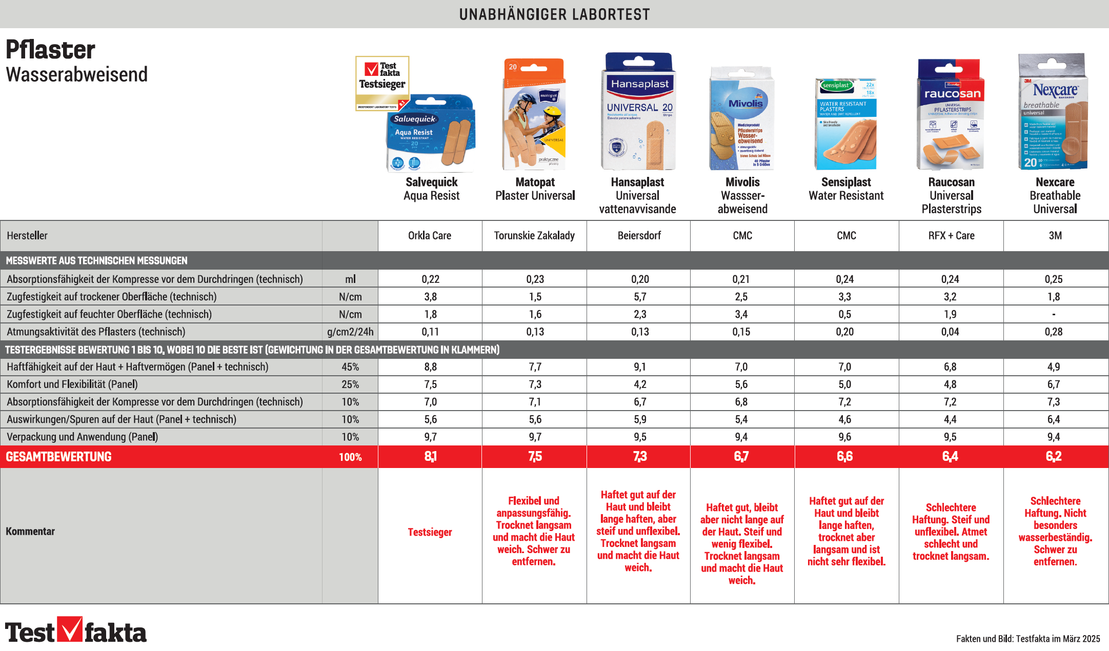 Von den 29 getesteten Pflastern waren 7 Marken aus dem österreichischen Markt. Die untenstehende tabelle zeigt, wie diese lokalen Produkte im unabhängigen Labortest abgeschnitten haben.